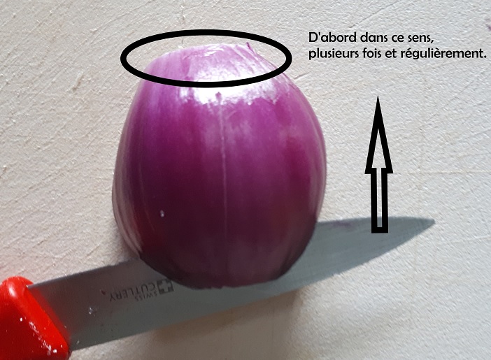 - Avec un petit couteau pointu, entailler régulièrement l’oignon dans la hauteur. Ne pas couper entièrement