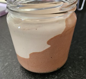 - J’utilise des pots à yogourt en verre d’une contenance d’environ 1,5dl. L’avantage étant le couvercle qui permet de fermer la mousse pendant sa prise au froid. Cette recette permet de remplir 4 de ces pots.