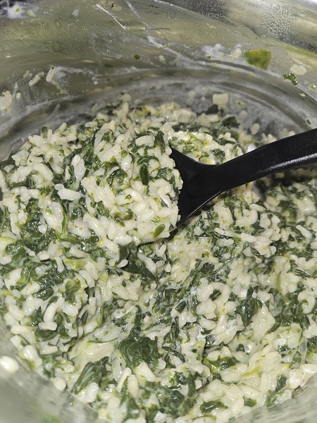 Dégeler les cubes d’épinards surgelés et les couper en morceaux, le but étant de hacher légèrement les épinards.