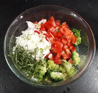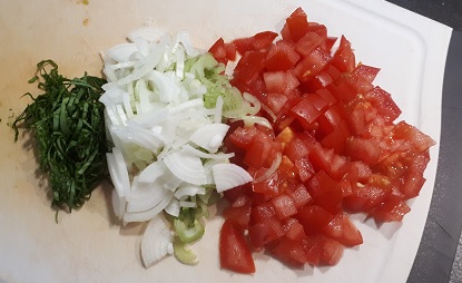 Couper les tomates en petits cubes, émincer l’oignon nouveau et le basilic. Réserver